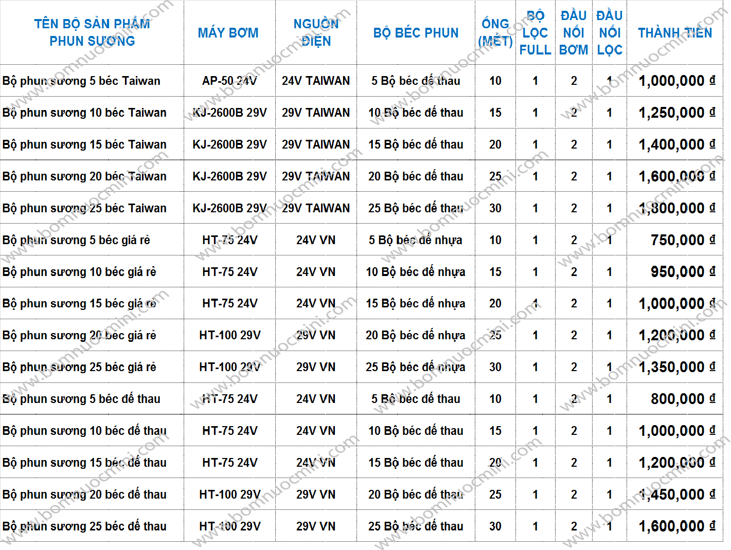 CÁC BỘ SẢN PHẨM PHUN SƯƠNG SETUP SẲN KHÁC: