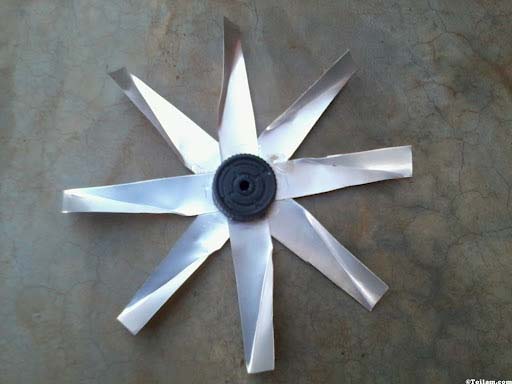 Bước 5: lấy phần ở bươc 2 ra, lắp cánh quạt vào trục môtơ sao cho cánh quạt nằm trong nắp lam sao cho cân đối, dán keo lại.