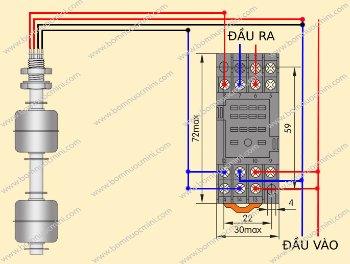 * Khách hàng cần sử dụng để chống tràn hay chống cạn với phao điện đôi cần kết hợp với role kính 14 chân - điện áp nào cũng được (Không được đấu tải trực tiếp, role 8 chân, khởi động từ - tiếp điểm sẽ bị dính)