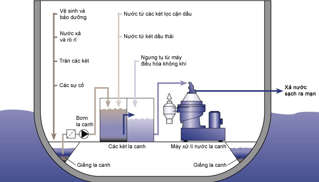 - MARPOL quy định rằng nước la canh không được bơm trực tiếp ra ngoài biển. Vì lí do này, nước la canh trước tiên được đi qua máy phân li dầu nước để tách các hạt dầu lơ lửng trong hỗn hợp. Khi mật độ dầu (tính bằng phần triệu) giảm xuống mức độ cho phép thì tàu mới được xả qua mạn, nhưng chỉ khi tàu đang hành trình.