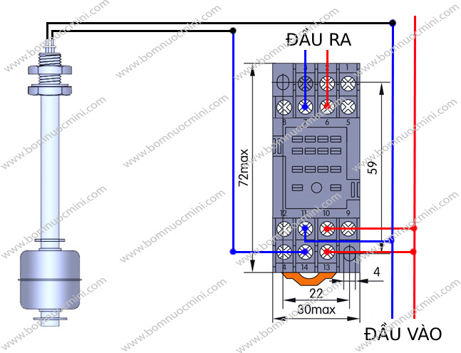 * Khách hàng cần sử dụng để chống tràn hay chống cạn với phao điện đôi cần kết hợp với role kính 8 chân, 14 chân - điện áp nào cũng được (Không được đấu tải trực tiếp, khởi động từ - tiếp điểm sẽ bị dính)